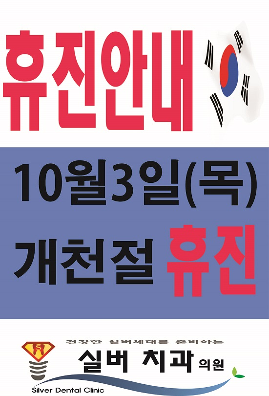 2024년 10월 3일 목요일 개천절 휴진입니다. 페이지 정보 작성자 최고관리자 작성일24-10-02 09:52 조회3,599회 댓글0건 이전글 다음글 목록 본문 . 댓글목록 등록된 댓글이 없습니다. 이전글 다음글 목록
