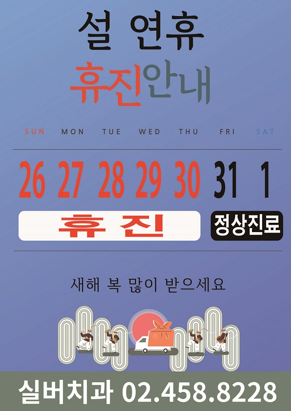 2025년 1월 설날 연휴 휴진 안내 드립니다. 페이지 정보 작성자 최고관리자 작성일25-01-20 17:24 조회2,488회 댓글0건 이전글 다음글 목록 본문 . 댓글목록 등록된 댓글이 없습니다. 이전글 다음글 목록