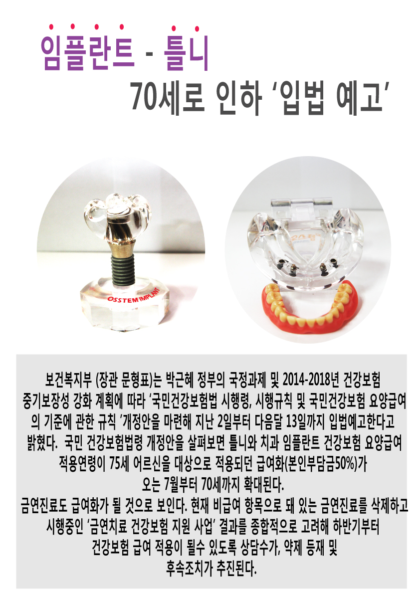 임플란트-틀니 70세로 인하 입법예고 페이지 정보 작성자 최고관리자 작성일15-04-23 16:10 조회5,521회 댓글0건 이전글 다음글 목록 본문 ... 댓글목록 등록된 댓글이 없습니다. 이전글 다음글 목록