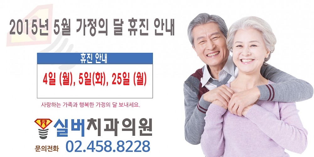 2015. 5월 가정의 달 휴진안내. 페이지 정보 작성자 최고관리자 작성일15-04-23 16:59 조회5,384회 댓글0건 이전글 다음글 목록 본문 ... 댓글목록 등록된 댓글이 없습니다. 이전글 다음글 목록