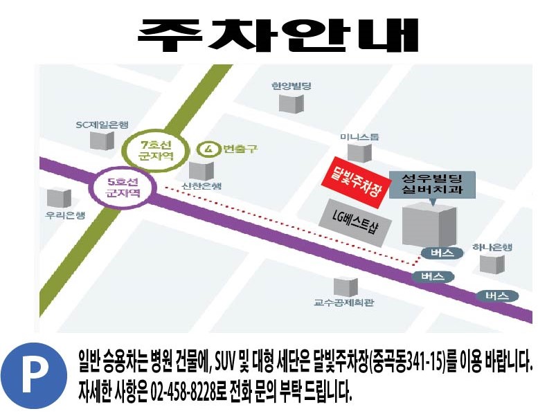 일반 승용차는 성우빌딩 병원 건물(천호대로571)에 대형 차량 및 SUV는 달빛주차장(중곡동341-15)에 주차 바랍니다.