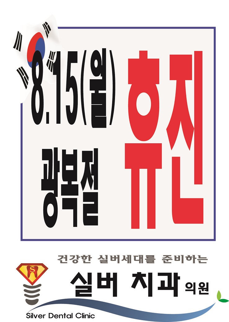 8월 15일 월요일 광복절 휴진입니다. 페이지 정보 작성자 최고관리자 작성일22-08-10 11:54 조회5,616회 댓글0건 이전글 다음글 목록 본문 . 댓글목록 등록된 댓글이 없습니다. 이전글 다음글 목록