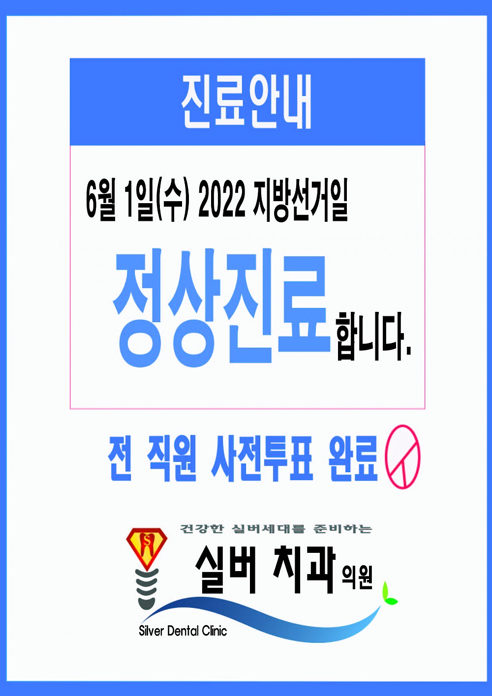 2022년 6월 1일 지방선거일 정상진료 합니다. 페이지 정보 작성자 최고관리자 작성일22-05-24 13:39 조회5,762회 댓글0건 이전글 다음글 목록 본문 . 댓글목록 등록된 댓글이 없습니다. 이전글 다음글 목록