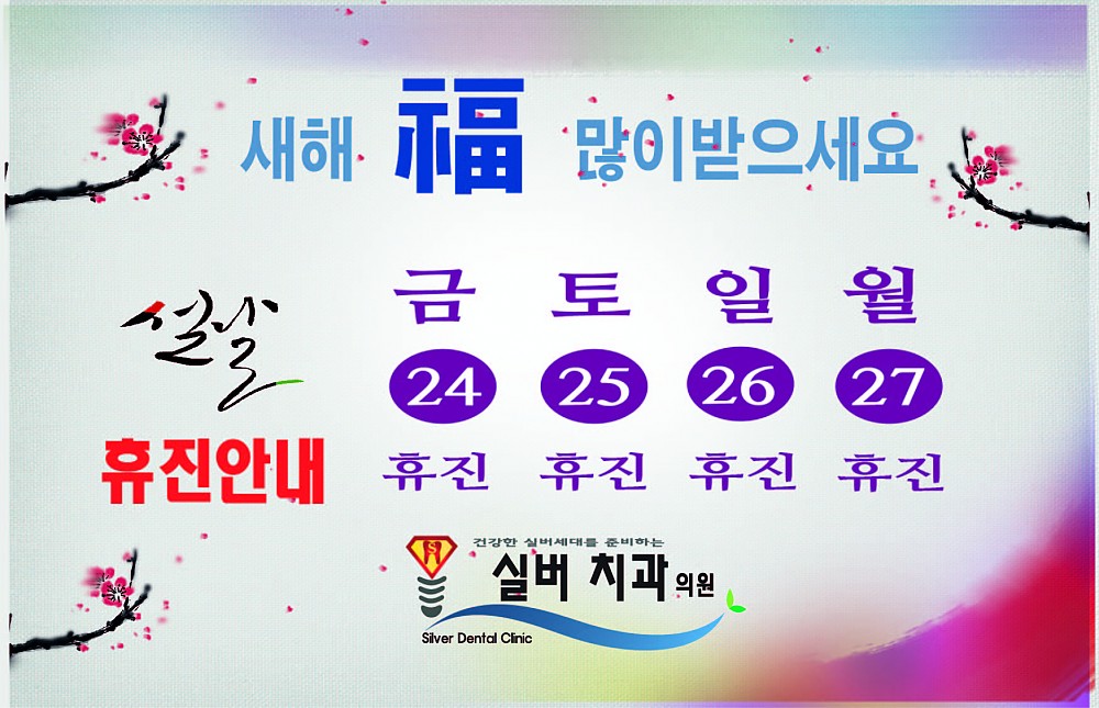 2020년 설날연휴 휴진 안내 페이지 정보 작성자 최고관리자 작성일20-01-14 13:06 조회6,079회 댓글0건 이전글 다음글 목록 본문 . 댓글목록 등록된 댓글이 없습니다. 이전글 다음글 목록