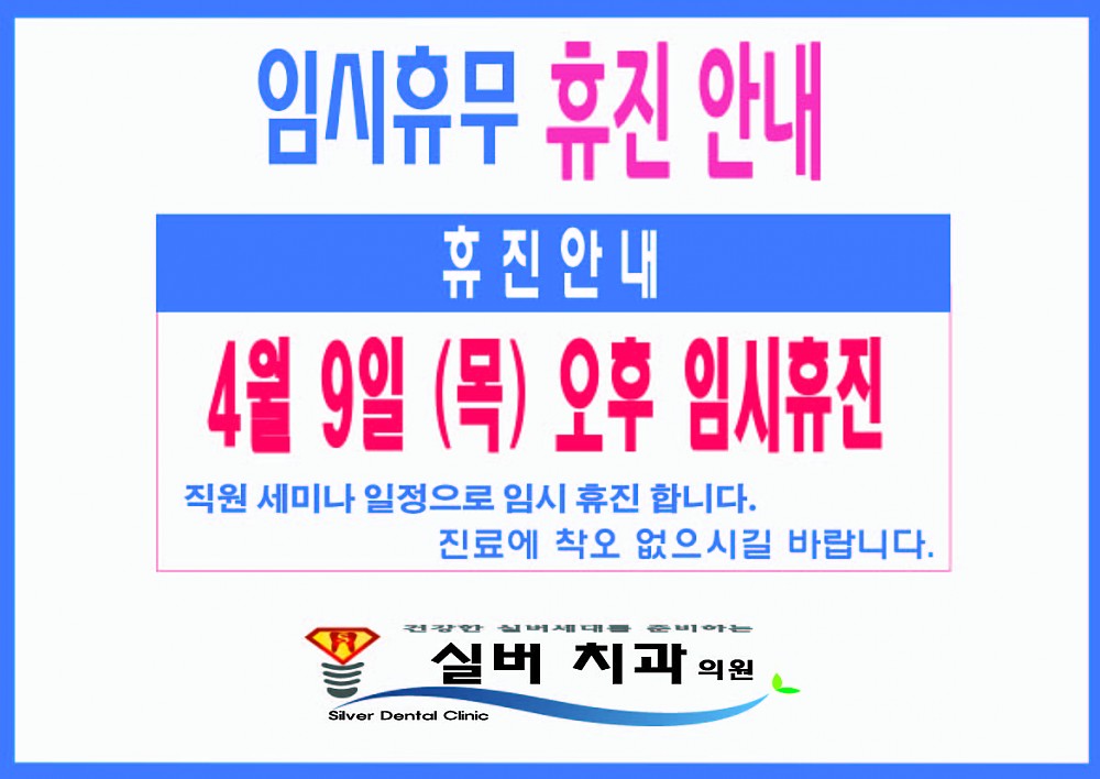 4월 9일(목) 오후 임시휴진 안내 페이지 정보 작성자 최고관리자 작성일20-04-02 12:20 조회6,035회 댓글0건 이전글 다음글 목록 본문 . 댓글목록 등록된 댓글이 없습니다. 이전글 다음글 목록