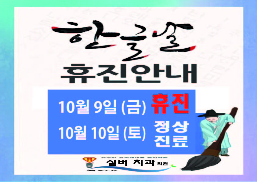 저희 실버치과는 10월 9일 금요일 한글날 공휴일로 휴진입니다.