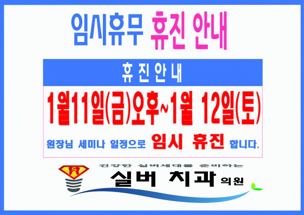2019년 1월 11일(금)오후~12일(토)임시휴진 안내 페이지 정보 작성자 최고관리자 작성일19-01-10 17:06 조회5,931회 댓글0건 이전글 다음글 목록 본문 . 댓글목록 등록된 댓글이 없습니다. 이전글 다음글 목록