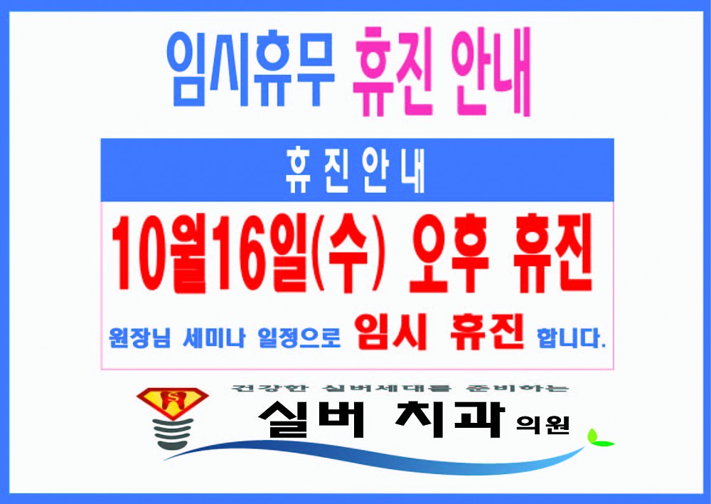 2019.10.16(수)오후 임시휴진 안내 페이지 정보 작성자 최고관리자 작성일19-10-14 13:40 조회6,244회 댓글0건 이전글 다음글 목록 본문 . 댓글목록 등록된 댓글이 없습니다. 이전글 다음글 목록