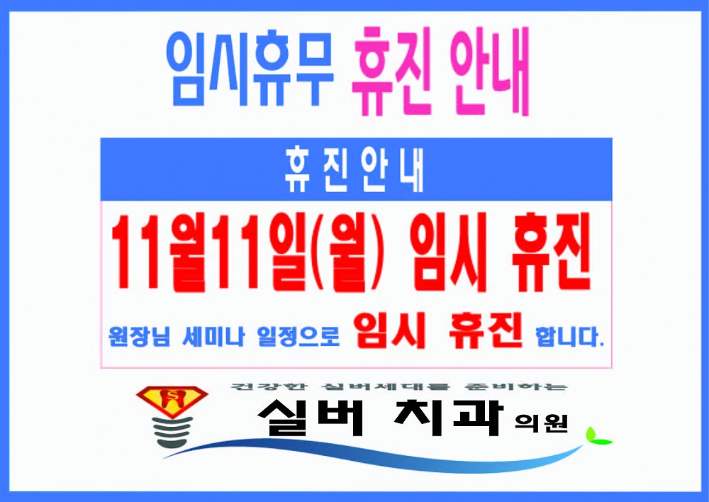 2019.11.11(월) 임시휴진안내 페이지 정보 작성자 최고관리자 작성일19-10-31 17:24 조회6,080회 댓글0건 이전글 다음글 목록 본문 . 댓글목록 등록된 댓글이 없습니다. 이전글 다음글 목록