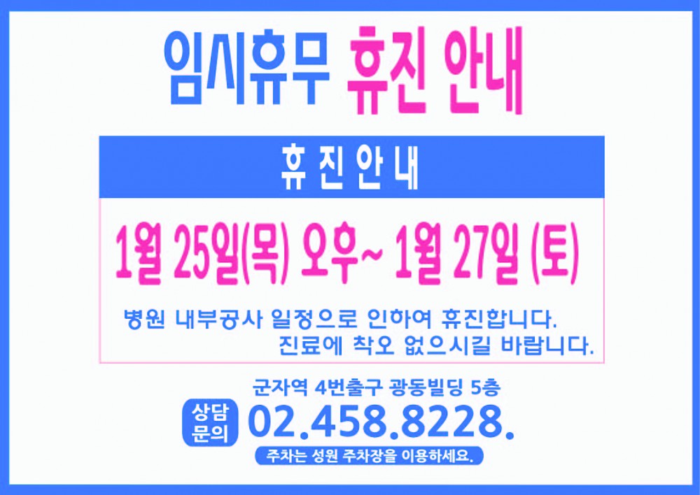 2018 년 1월 25(목)오후 ~27(토) 임시 휴무 안내 페이지 정보 작성자 최고관리자 작성일18-01-22 09:14 조회5,918회 댓글0건 이전글 다음글 목록 본문 . 댓글목록 등록된 댓글이 없습니다. 이전글 다음글 목록
