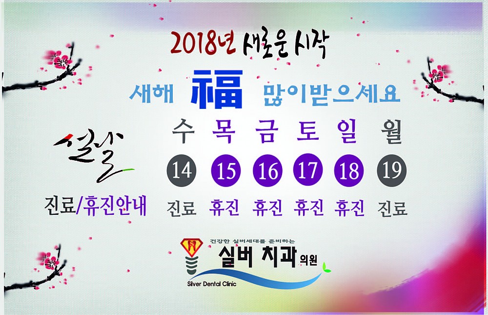2018 년 2월 설날 휴진 안내 페이지 정보 작성자 최고관리자 작성일18-02-13 17:38 조회5,589회 댓글0건 이전글 다음글 목록 본문 . 댓글목록 등록된 댓글이 없습니다. 이전글 다음글 목록