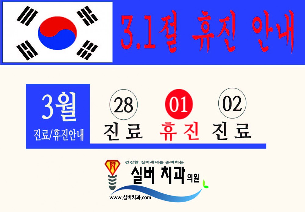 3월1일 3.1절 휴진안내 페이지 정보 작성자 최고관리자 작성일18-02-28 10:01 조회5,666회 댓글0건 이전글 다음글 목록 본문 . 댓글목록 등록된 댓글이 없습니다. 이전글 다음글 목록