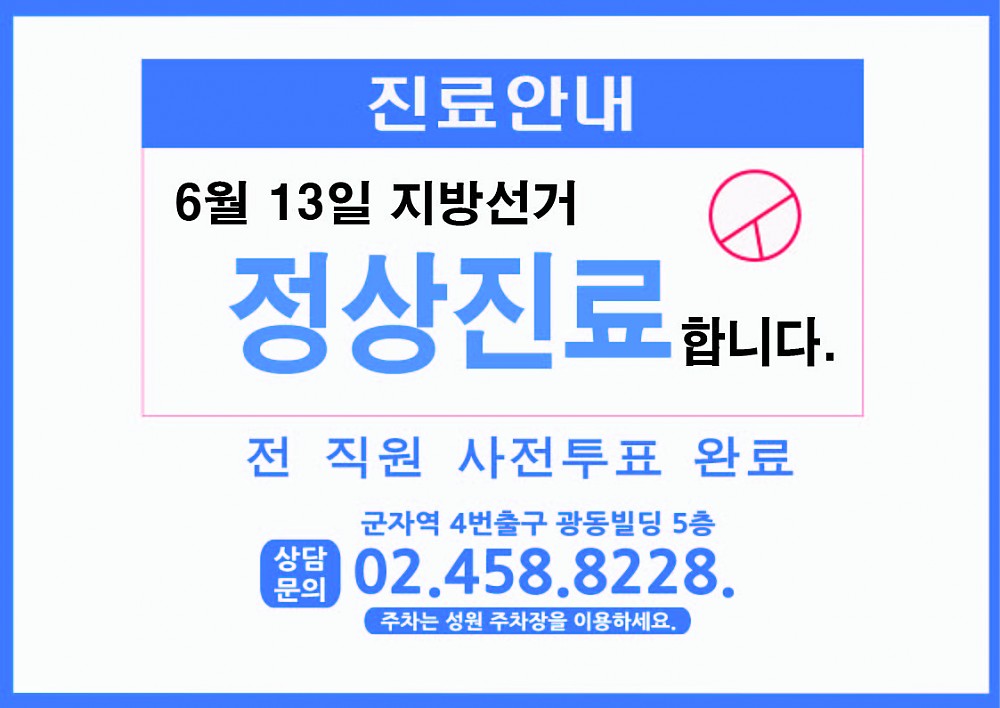 6월 13일 지방선거일 정상진료 안내 페이지 정보 작성자 최고관리자 작성일18-06-11 13:32 조회5,735회 댓글0건 이전글 다음글 목록 본문 . 댓글목록 등록된 댓글이 없습니다. 이전글 다음글 목록