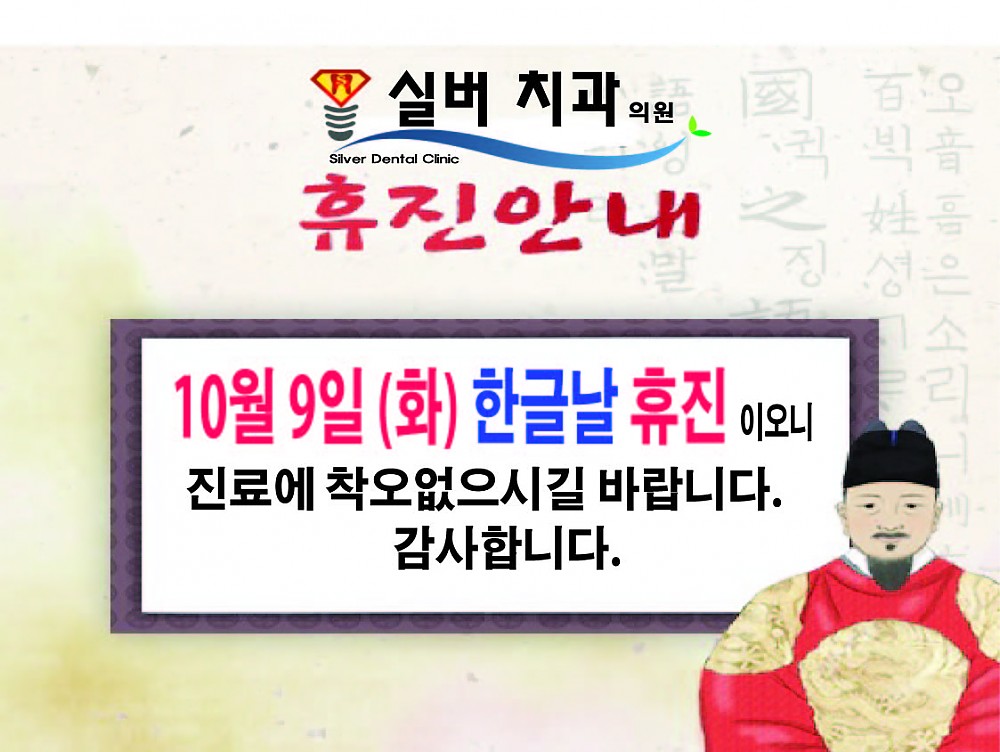 10월 9일 한글날 휴진안내 페이지 정보 작성자 최고관리자 작성일18-10-08 12:17 조회5,859회 댓글0건 이전글 다음글 목록 본문 . 댓글목록 등록된 댓글이 없습니다. 이전글 다음글 목록