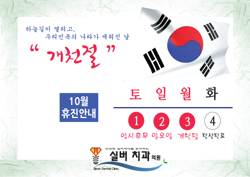 10월 개천절 휴무안내 페이지 정보 작성자 최고관리자 작성일16-09-28 17:27 조회5,576회 댓글0건 이전글 다음글 목록 본문 - 내원 및 진료에 착오없으시기를 바랍니다. - 댓글목록 등록된 댓글이 없습니다. 이전글 다음글 목록