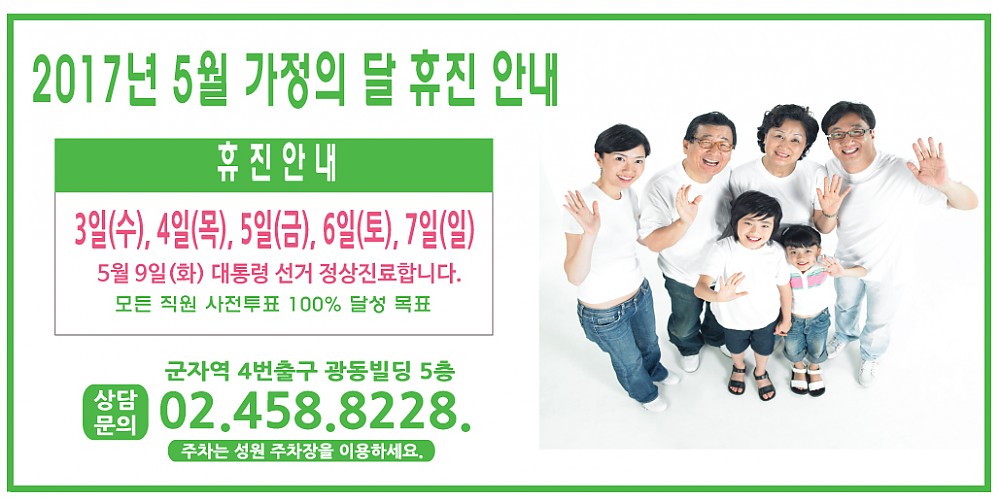 2017. 5월 가정의 달 휴진안내 페이지 정보 작성자 최고관리자 작성일17-05-01 13:56 조회5,590회 댓글0건 이전글 다음글 목록 본문 행복한 가정의 날 보내시고, 진료에 착오없으시길 바랍니다. 댓글목록 등록된 댓글이 없습니다. 이전글 다음글 목록