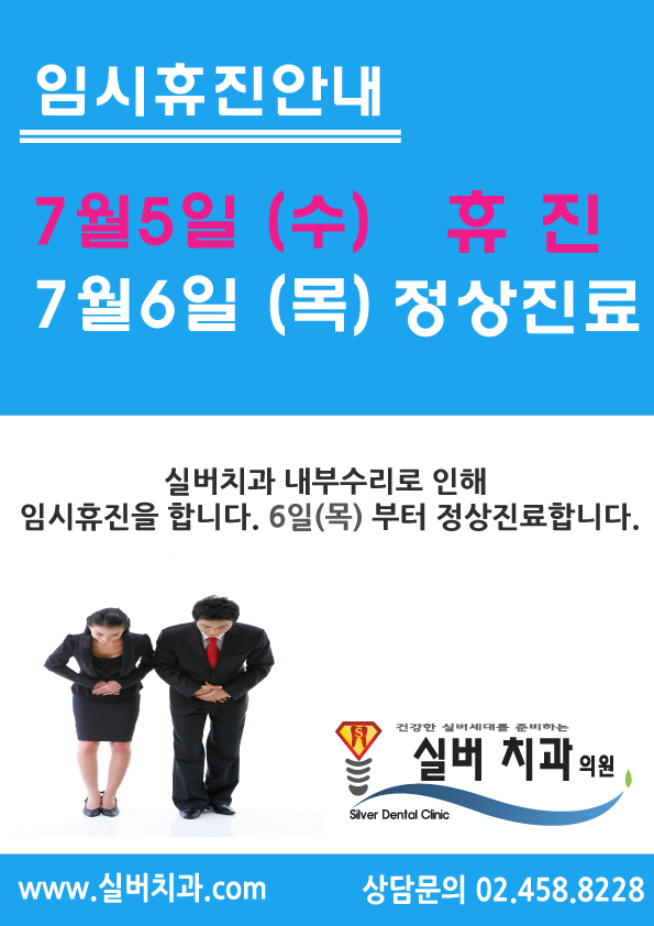 2017. 7월 임시휴진안내 페이지 정보 작성자 최고관리자 작성일17-07-03 11:49 조회5,699회 댓글0건 이전글 다음글 목록 본문 - 치과 내부 수리로 인하여 7월5일(수) 임시휴진합니다. 진료에 착오없으시길 바랍니다. 댓글목록 등록된 댓글이 없습니다. 이전글 다음글 목록