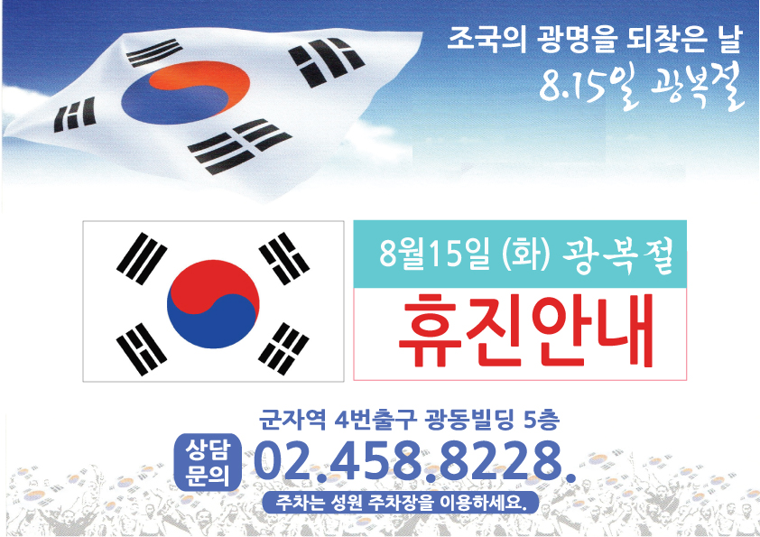 2017. 8월 광복절 휴진안내 페이지 정보 작성자 최고관리자 작성일17-08-09 13:34 조회5,752회 댓글0건 이전글 다음글 목록 본문 진료에 착오없으시길 바랍니다. 댓글목록 등록된 댓글이 없습니다. 이전글 다음글 목록