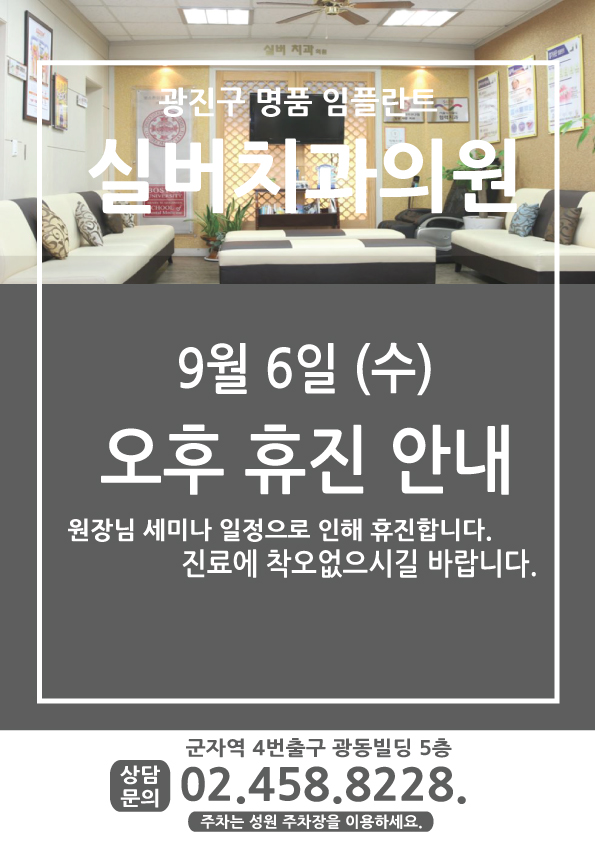 원장님의 세미나 일정으로 9월6일(수) 오후 진료 휴진을 하게 되었습니다.