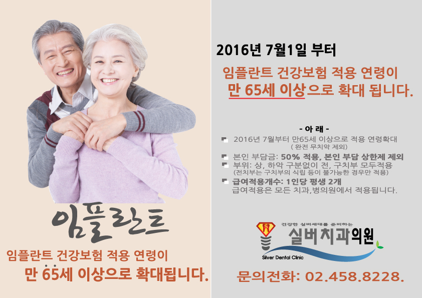 2016. .7.1 부터 임플란트 보험적용이 만65세로 확대적용되었습니다.